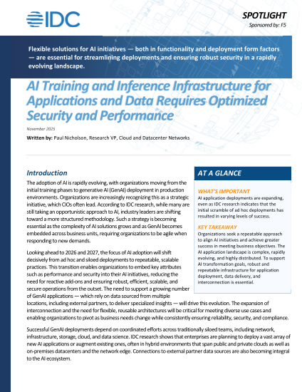 IDC Spotlight, AI Training and Inference Infrastructure for Applications and Data Requires Optimized Security and Performance, Sponsored by F5. Doc. #US53901525, Publication Date (November 11, 2025)